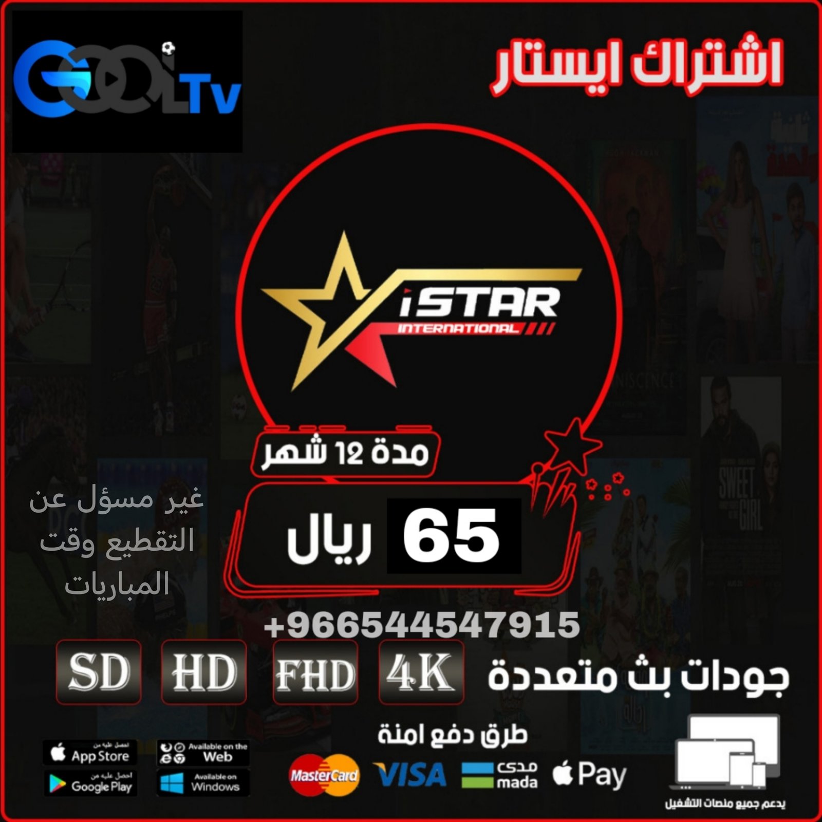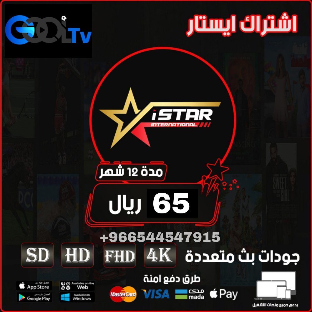 تطبيق ايستار الذي يحتوى على مكتبة افلام عربيه واجنبيه مترجمه ويشمل الاشتراك اكثر من باقة متنوعه باشتراك واحد , كما يحتوى على القنوات بجودات مختلفة و مكتبة مسلسلات يعمل على جميع الجوالات والاجهزة اللوحية وجميع شاشات السمارت